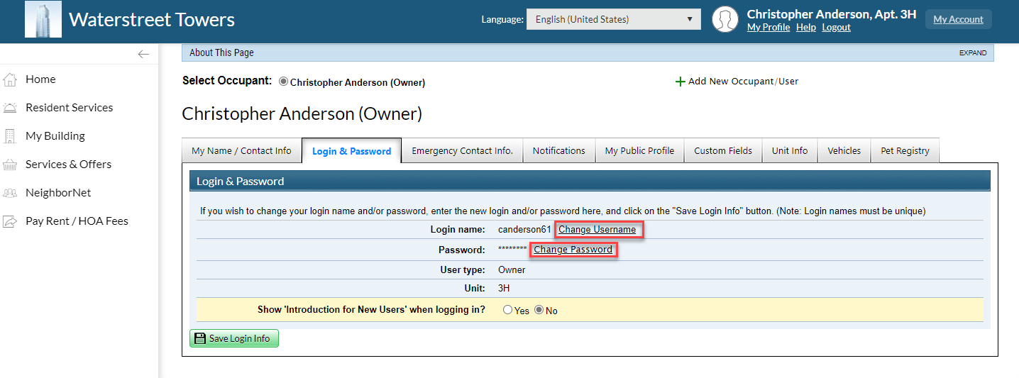 To change your Login Name or Password, click on the Edit Profile tab, and select the Login and Password tab. After changing your login name and password, remember to click on the Save Changes button. Note that your login name must be unique, and cannot already be in use by another BuildingLink user. If you receive a message alerting you that the login name you want to use is "taken" already, consider adding some numbers or digits to your preferred login name to make it unique.