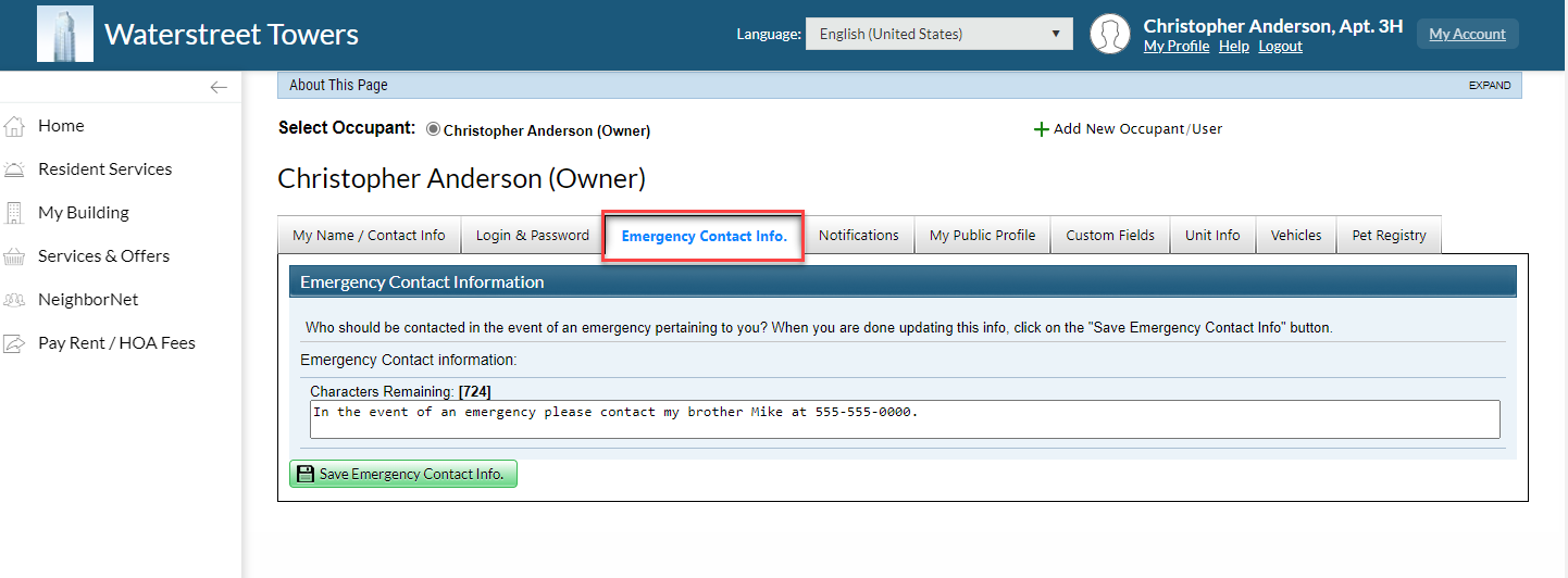 The Emergency Contact Info saved in BuildingLink will be the go-to resource for your building management in the case of an emergency. To update that information, click on the Edit Profile tab, and select Emergency Contact Info. Make sure to click Save Emergency Contact Info after making changes.