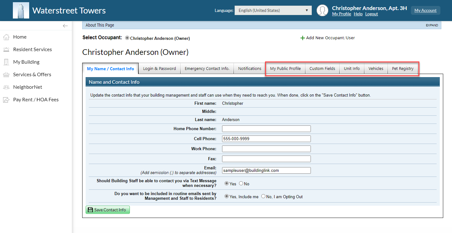 Under the Edit Profile tab, you’ll see a section to edit My Name / Contact Info. In this section, you’ll be able to change all general contact information for your unit or apartment. Keep in mind that all unit information is hidden from other residents unless you enable the "My Public Profile" option.'