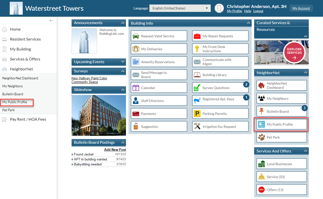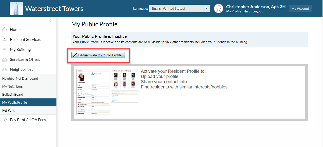 To create a public profile for other residents in your building to view, click on the My Public Profile button in the NeighborNet section of BuildingLink.