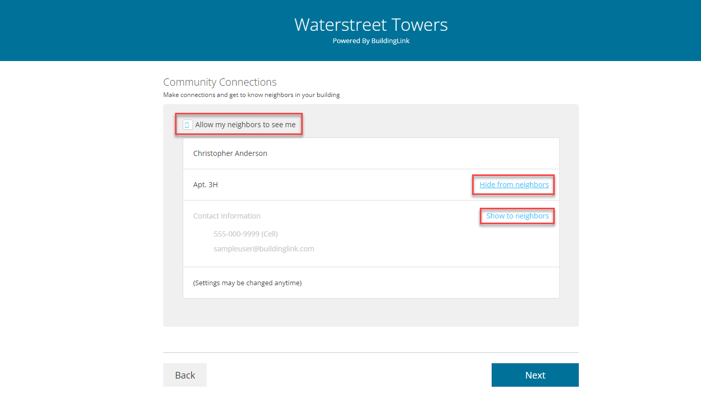 When you first log in to BuildingLink, you'll be prompted to opt in/out of your public profile and choose what information you would like to display to your neighbors.