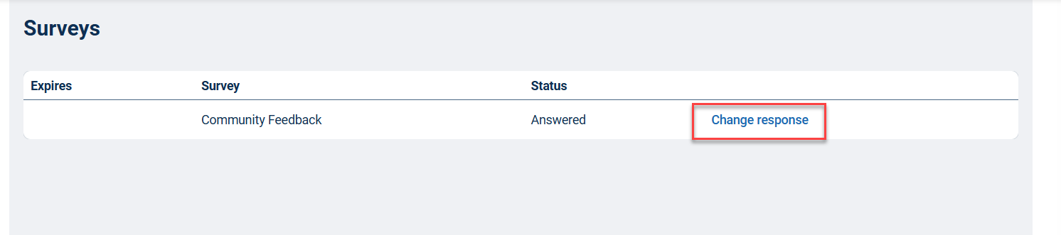 On the Surveys page, you will see all the active surveys you have already completed and any surveys still waiting for a response. Click the Change Response link on the right of the survey row and follow the same steps for submitting responses as above.