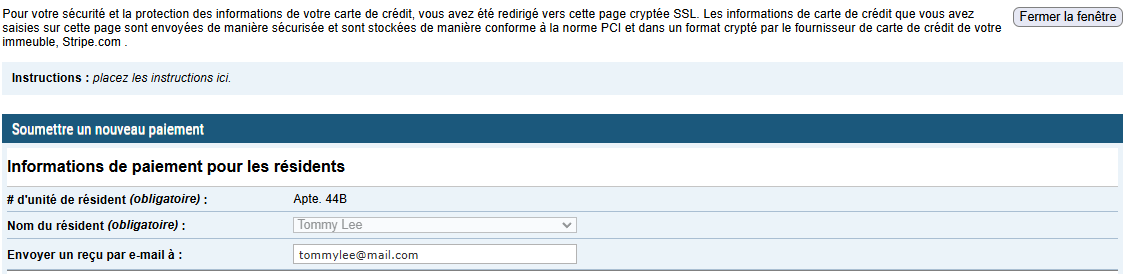 La fonction Paiements permet aux résidents de soumettre divers paiements dans le portail des résidents de BuildingLink pour traitement et remboursements via Stripe, un service de traitement des paiements en ligne. Cette fonctionnalité fournit également aux résidents une vue de l'historique des paiements pour faciliter le suivi des paiements.