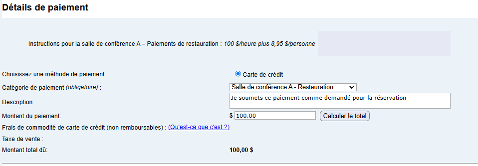 - Calculer le total (bouton) : En cliquant sur ce bouton, vous calculerez automatiquement les frais et un montant total dû en fonction du montant du paiement.