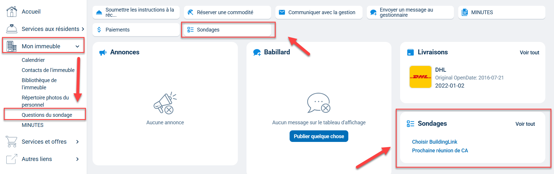 Si votre immeuble a permis aux résidents de soumettre des réponses à un sondage par l'intermédiaire de BuildingLink, vous verrez un bouton Questions du sondage dans la section « Informations sur l’immeuble » de votre page d'accueil. Un cercle avec le nombre de sondages sans réponse apparaîtra pour vous permettre de savoir qu'il y a de nouveaux sondages en attente de réponse. Cliquez sur le bouton Questions du sondage pour accéder au sondage.